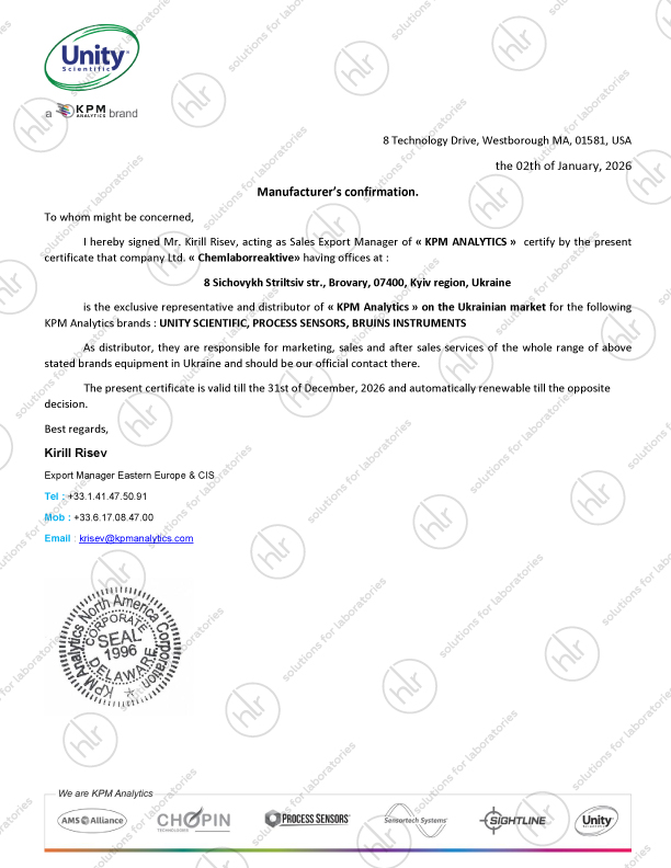 ООО «ХИМЛАБОРРЕАКТИВ» – эксклюзивный дистрибьютор компании Unity Scientific на территории Украины. Наши инженеры и методисты прошли обучение на заводе производителя и осуществляют профессиональную пусконаладку оборудования, калибровку анализаторов, производят гарантийное и постгарантийное обслуживание.
